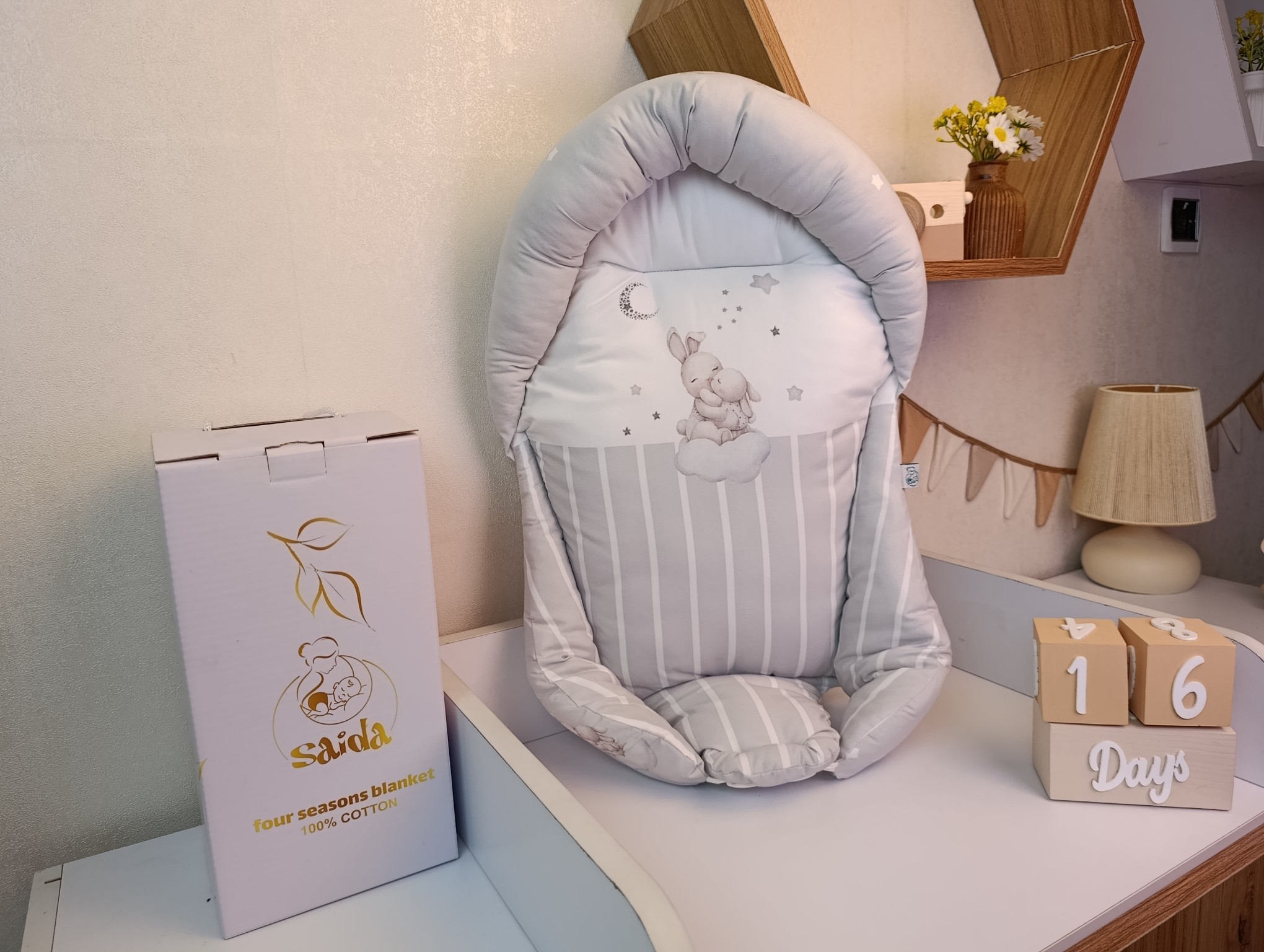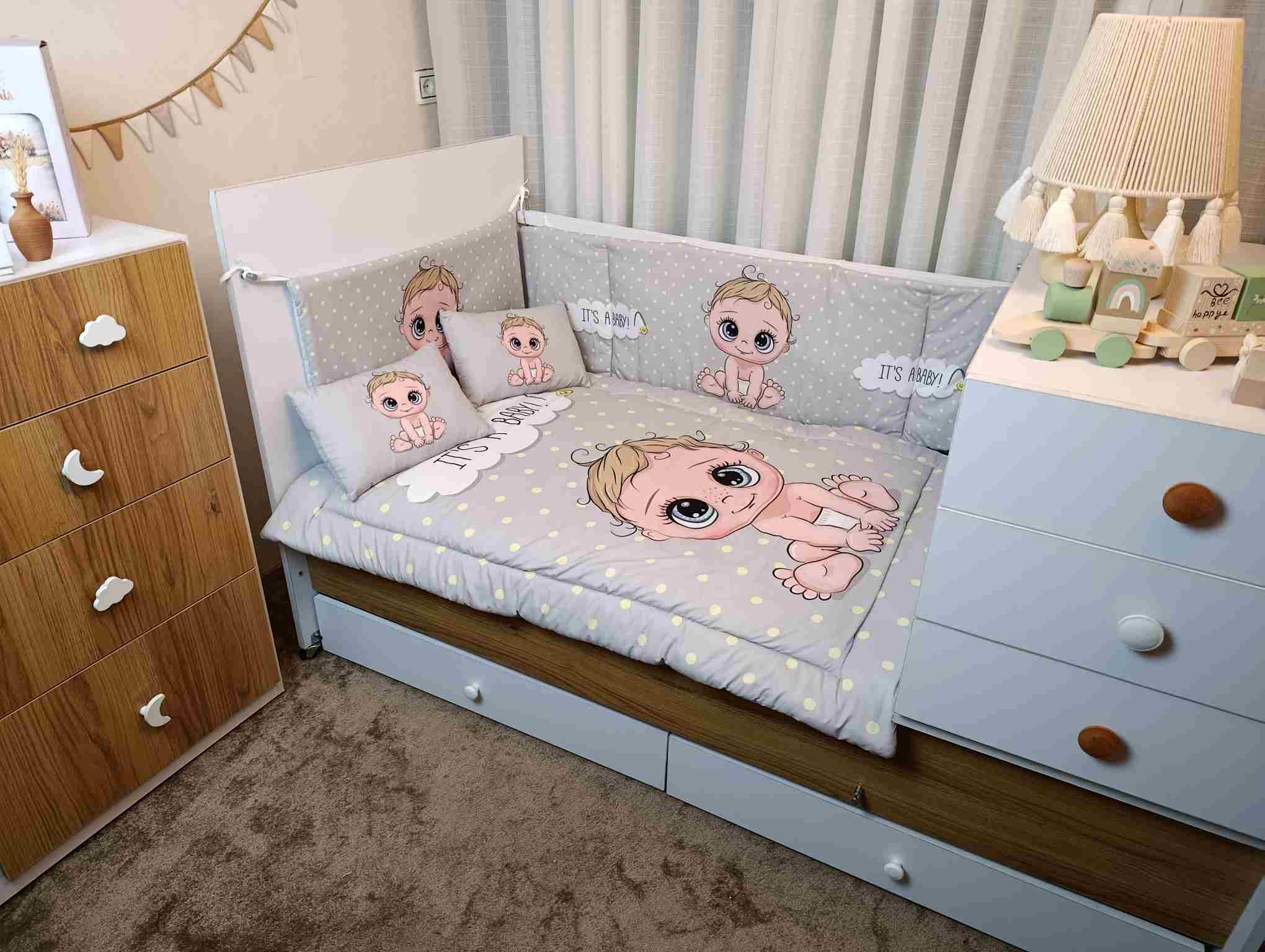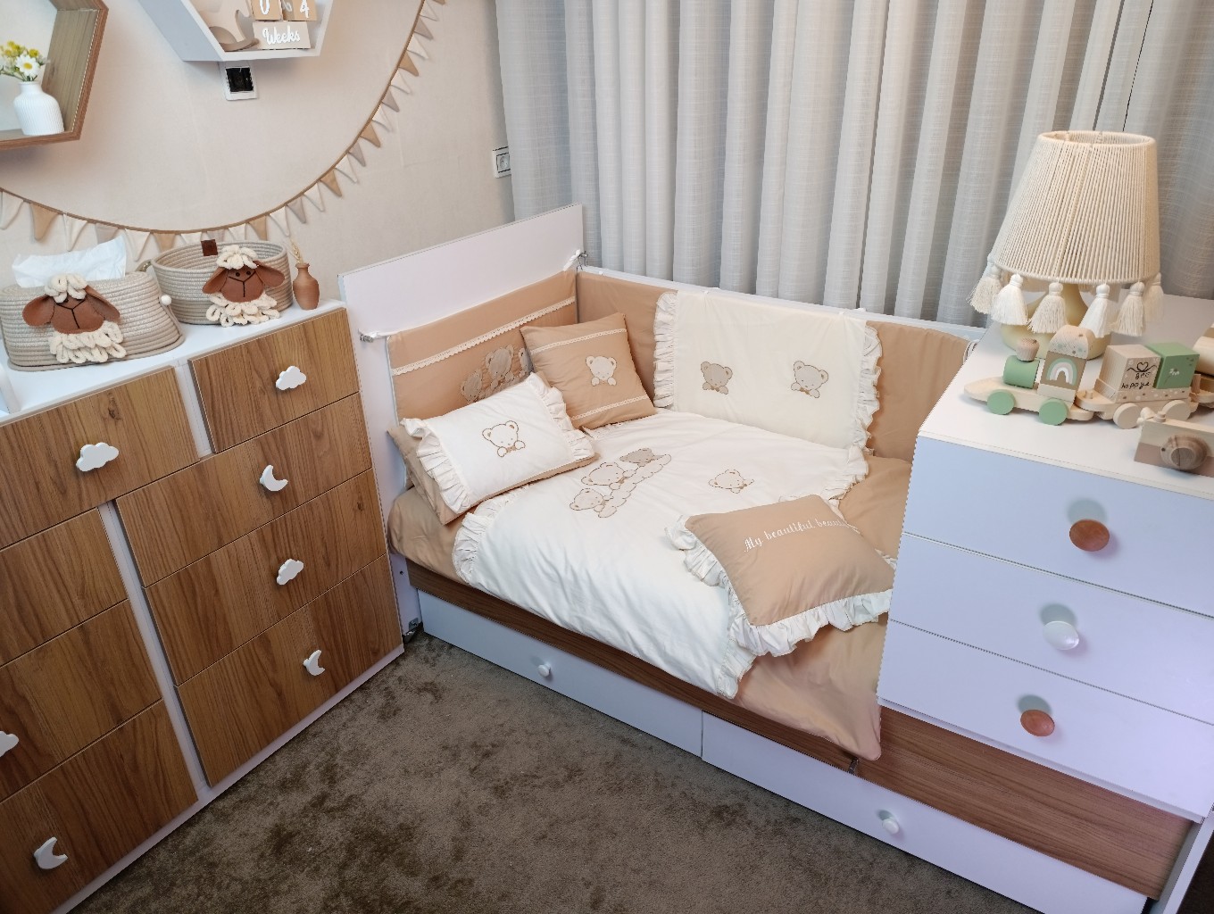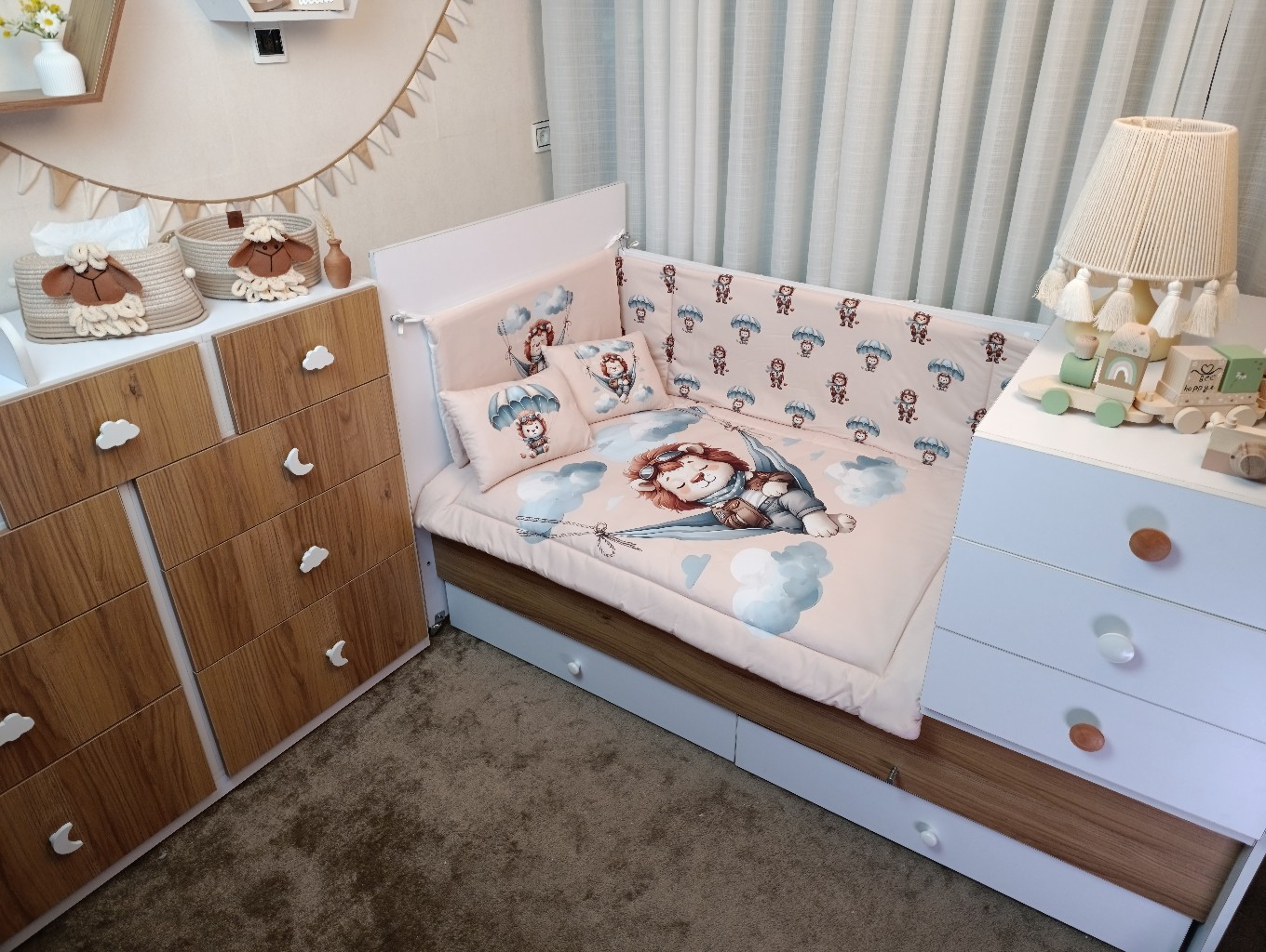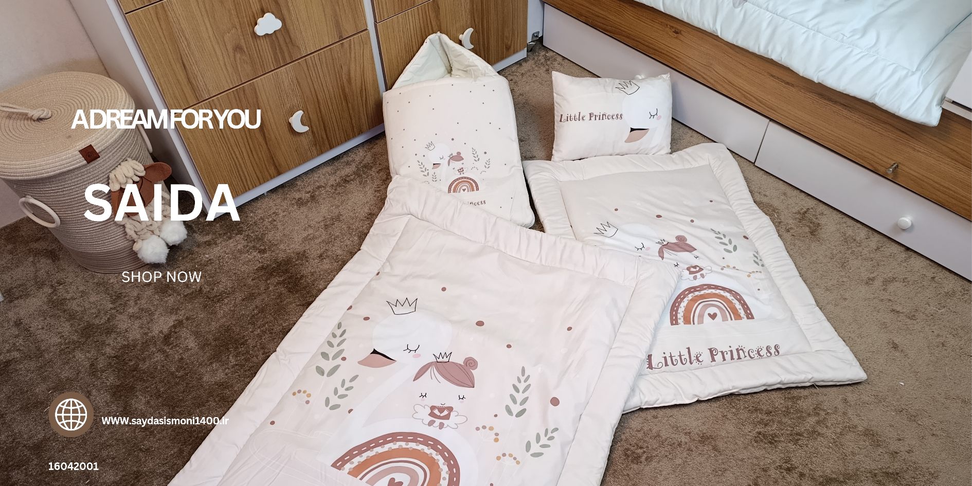 با سایدا دیگر نگران چیدمان اتاق نخواهید بود. روتختی، آغوشی، لوستر، آباژور و آویز موزیکال — همه چیز هماهنگ و آماده است تا اتاقی زیبا و امن برای کوچولوی شما بسازیم.