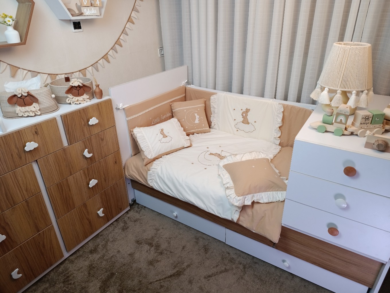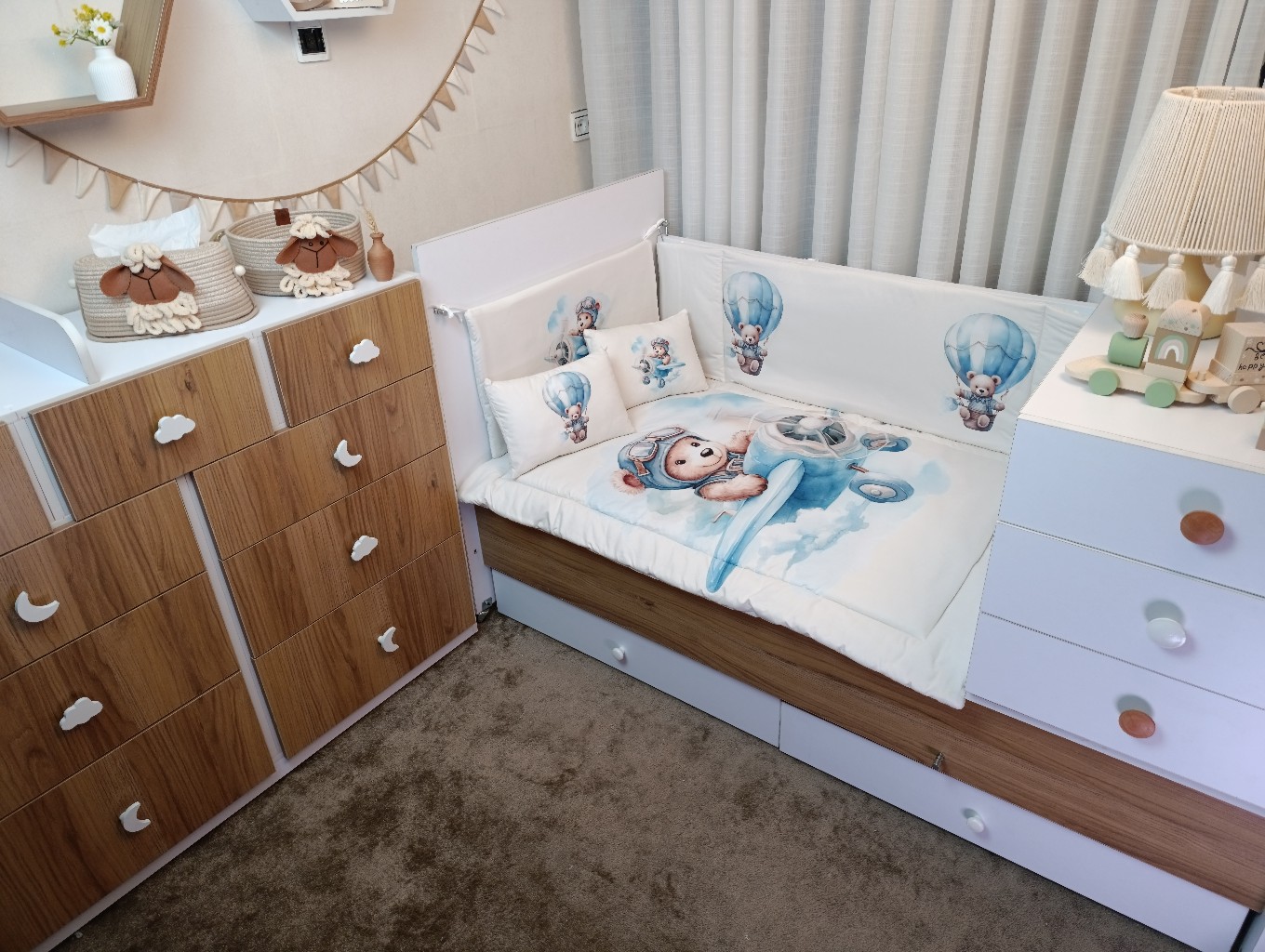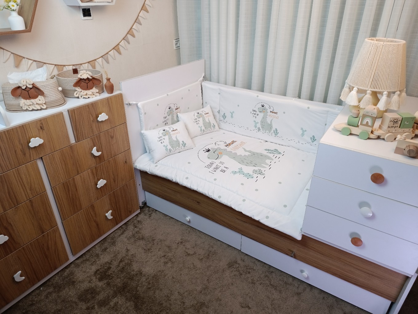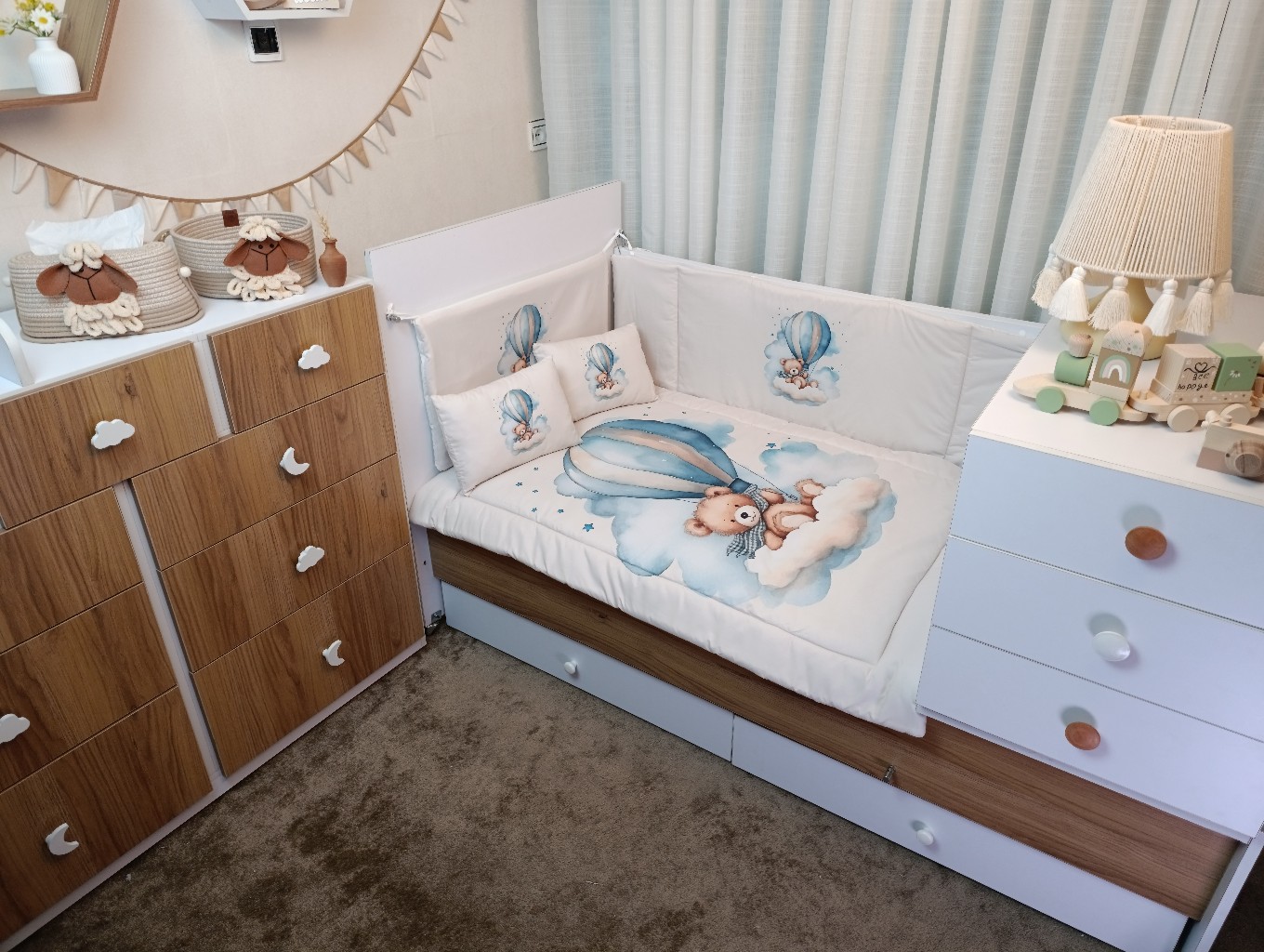 با سایدا دیگر نگران چیدمان اتاق نخواهید بود. روتختی، آغوشی، لوستر، آباژور و آویز موزیکال — همه چیز هماهنگ و آماده است تا اتاقی زیبا و امن برای کوچولوی شما بسازیم.