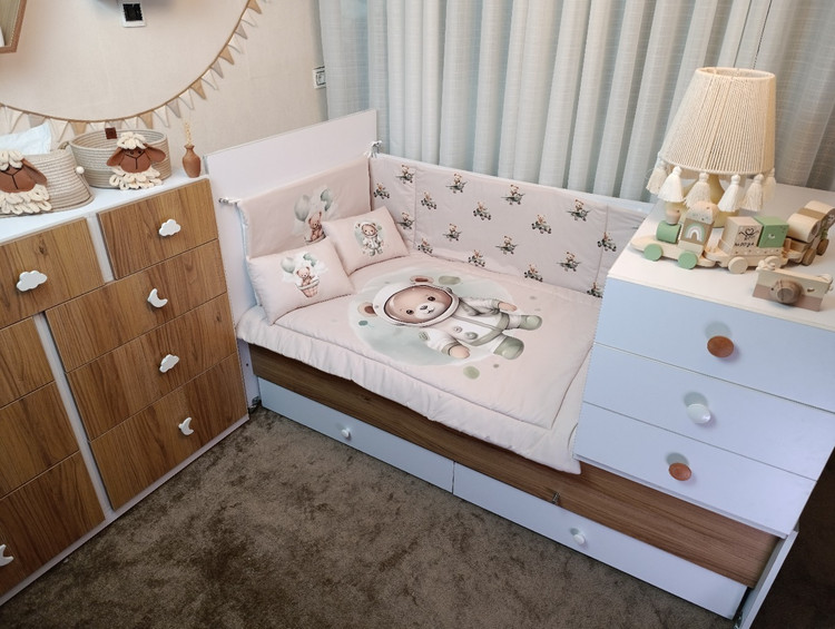 این سرویس با داشتن گاردهای محافظ، بالش و روبالشتی، لحاف و ملحفه، مجموعهای کامل برای راحتی، ایمنی و زیبایی تخت نوزاد فراهم میکند.