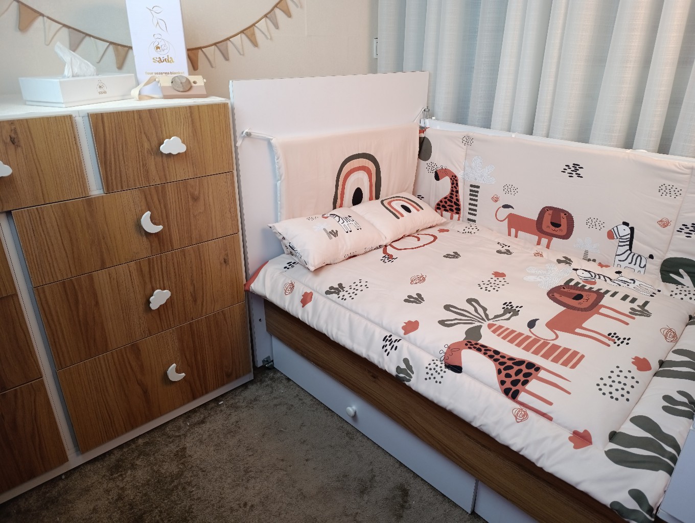 این سرویس با داشتن گاردهای محافظ، بالش و روبالشتی، لحاف و ملحفه، مجموعهای کامل برای راحتی، ایمنی و زیبایی تخت نوزاد فراهم میکند.